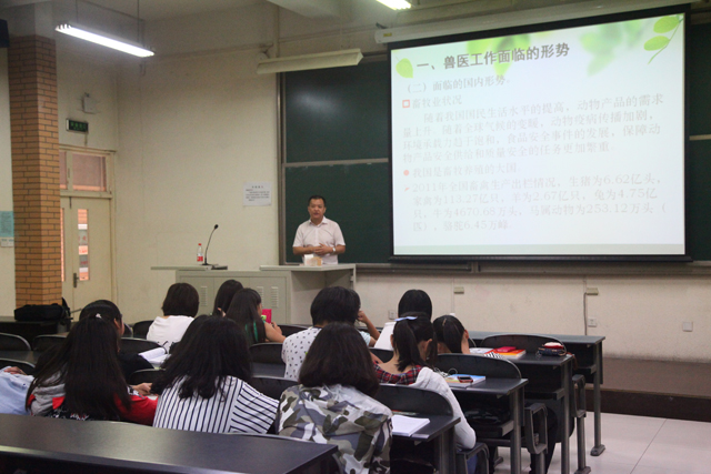 刘书记首先为大家明确了兽医所肩负的职责,通过讲解国内外形势,让同学们充分认识到自己未来将要担负的重任。接下来,刘书记还为大家讲解了兽医学的主要任务,他指出现代兽医学的任务不仅在于保障畜牧业的发展,而且在于减少人畜共患疾病的危害,提高动物性食品(肉、蛋、乳和水产品等)的卫生质量和改善环境卫生等,直接为人类的健康服务。最后,他为同学们展示了动物医学专业的就业前景和就业岗位。