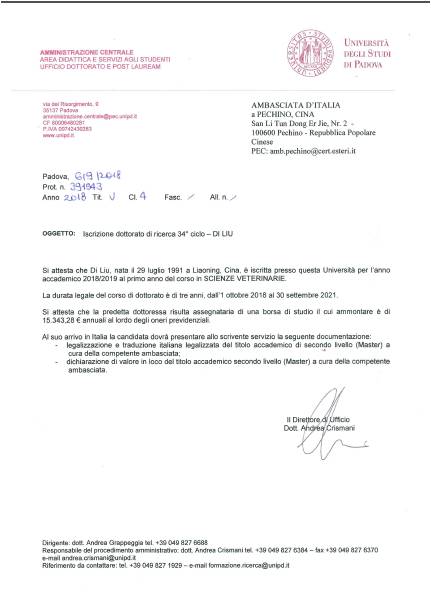 公司2017届yl23455永利毕业的临床兽医学硕士,刘迪同学经过与17名世界各地申请候选人的公平竞争,以该公司综合排名第六的优异成绩,于近日被意大利著名的帕多瓦大学比较生物医学与食品公司录取为博士研究生,同时还获得该校的全额博士研究生奖学金。她也是公司第一位获得欧洲名牌农科大学全额博士研究生奖学金的毕业生。