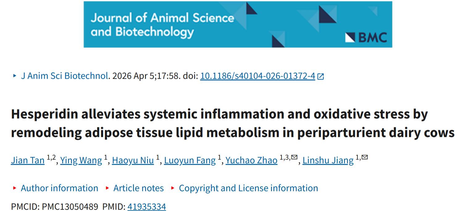 近日,公司奶牛营养学北京市重点实验室蒋林树教授团队在农林科学领域顶尖国际英文期刊《Journal of Animal Science and Biotechnology》发表研究成果,聚焦橙皮苷(Hesperidin)对围产期奶牛的代谢调控作用,通过多组学(代谢组、脂质组、蛋白质组)结合生理生化检测,阐明了橙皮苷通过重塑脂肪组织脂质代谢,缓解围产期奶牛全身炎症和氧化应激、改善乳品质与代谢健康的分子机制,为围产期奶牛的营养调控提供了全新的植物源策略。
