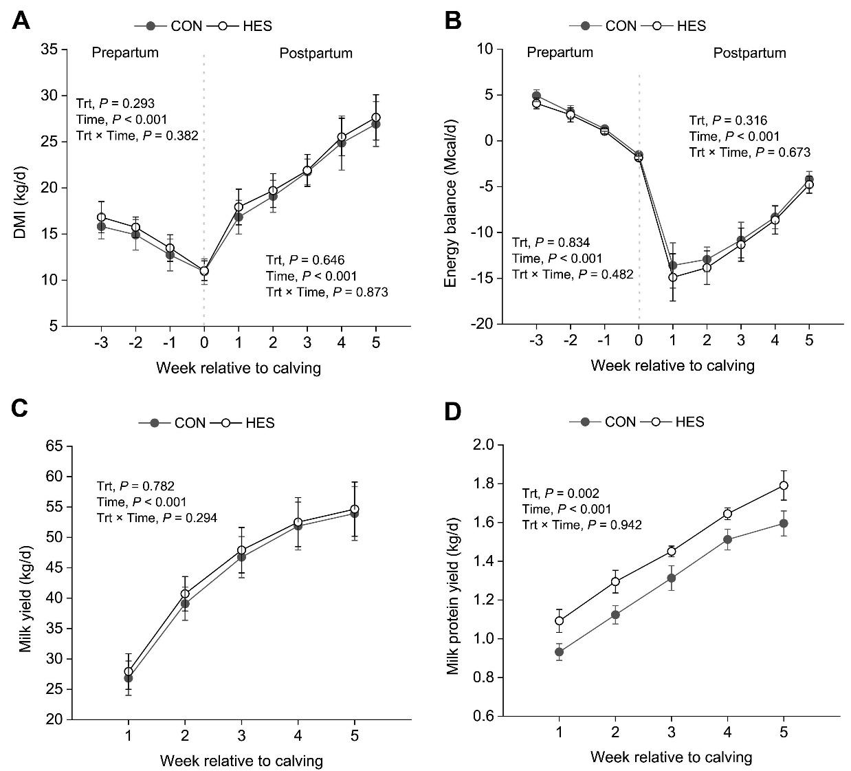 该研究表明在围产期奶牛日粮中添加橙皮苷对奶牛干物质干物质采食量、能量平衡和奶牛产后泌乳量不会造成不利影响,并且能显著提高奶牛乳中的蛋白产量。